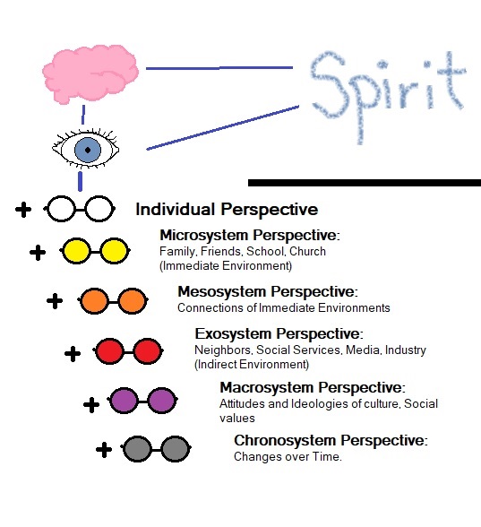 Ok, let me explain. In this dream, each person was categorized as two parts, physical and spiritual. The brain represents our physical self (which is also our mind and emotion). Our eyes are the windows of perception. From a previous blog I shared a diagram that explained Bronfenbrenner’s systems, and here they are depicted as lenses. With each system, the more ‘lenses’ the darker and darker the perspective. I’m not meaning dark as in bad or evil, but as a form or clarity. The more information you add, the more complex things become, the less and less you can see. Now you can also see, that this is primarily under the physical aspects of human beings because these are physical outlooks and perceptions. You can say that some of these systems of information can influence the spirit in a way, with religious and cultural values, but these are considered outside sources and not directly our own spirit.